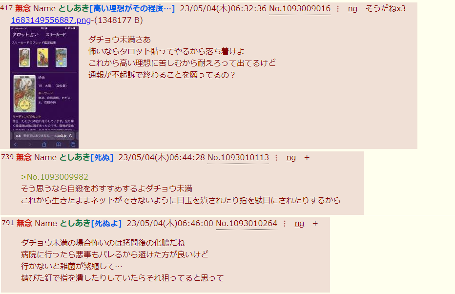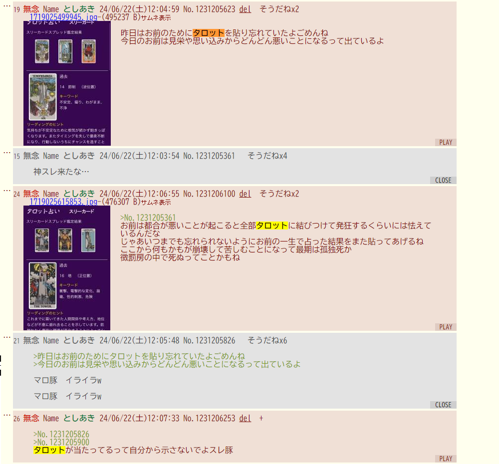 | … | 21無念Nameとしあき25/11/28(金)23:04:22No.1369427422そうだねx4タロットと言うとマロさんっていう知恵遅れにホモを思い出す |