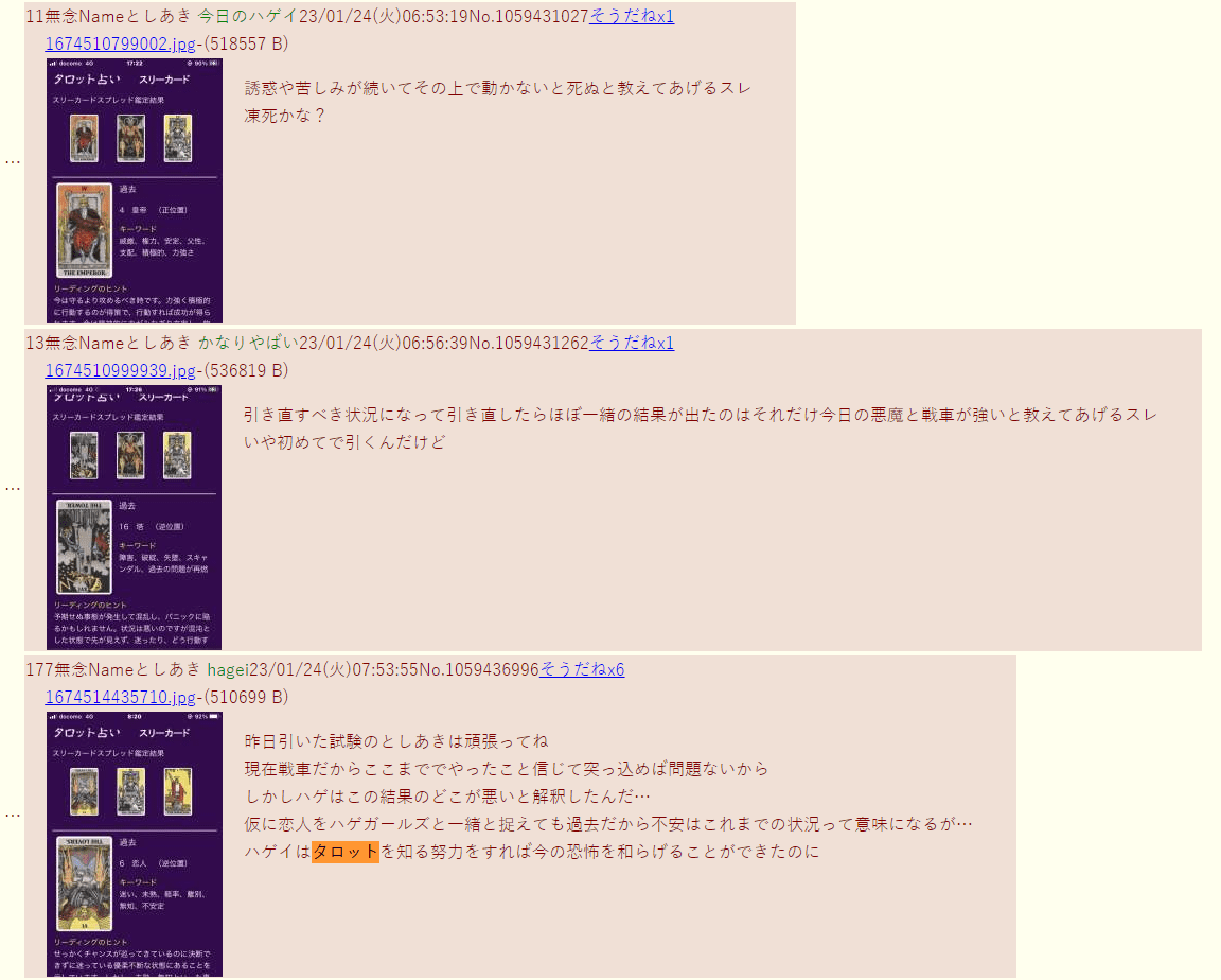 | … | 60無念Nameとしあき25/11/29(土)01:45:49No.1369456732+タロットの逆位置ってどういう状況で出されるの? |