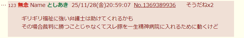 | … | 57無念Nameとしあき25/11/29(土)01:37:32No.1369455906そうだねx3子豚はやたらと国選弁護人を無能扱いするのォ |