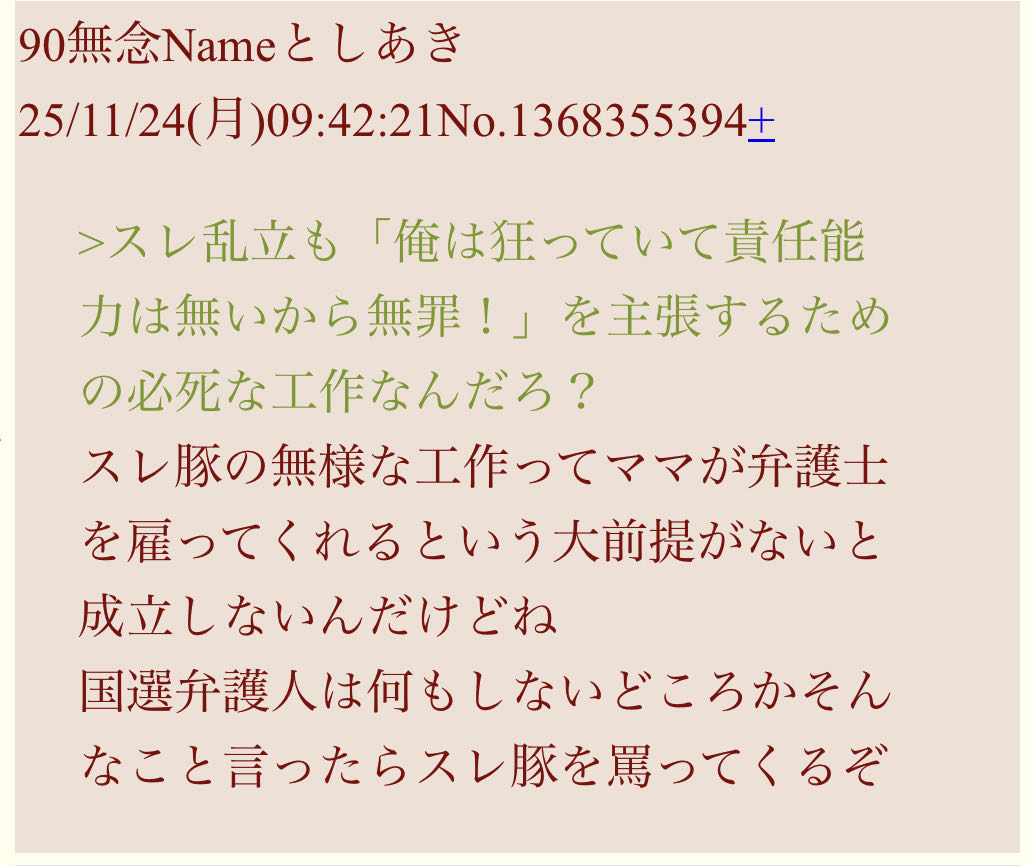 | … | 61無念Nameとしあき25/11/29(土)01:52:13No.1369457333+>子豚はやたらと国選弁護人を無能扱いするのォ |