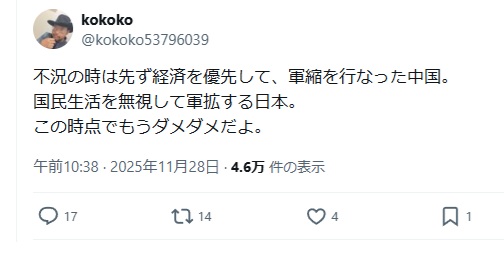 | … | 37無念Nameとしあき25/11/29(土)04:54:22No.1369465691+>つまり、日本は中国が言うような軍国主義じゃないし武力侵攻するような国ではないと明言した |