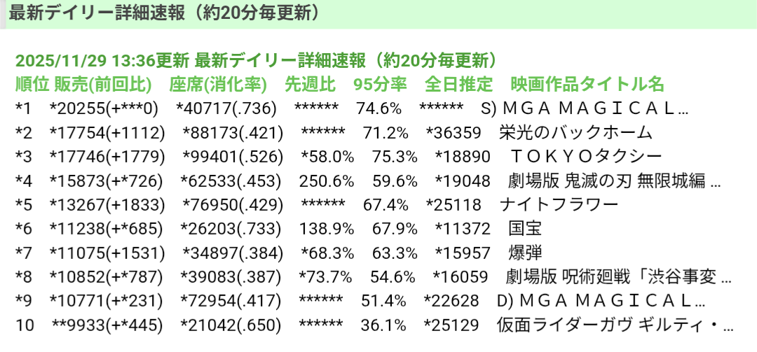 | … | 700無念Nameとしあき25/11/29(土)15:08:39No.1369556005+近所の話だがIMAXが昼鬼滅で夜スカだから夜には伸びるんじゃないですかね |