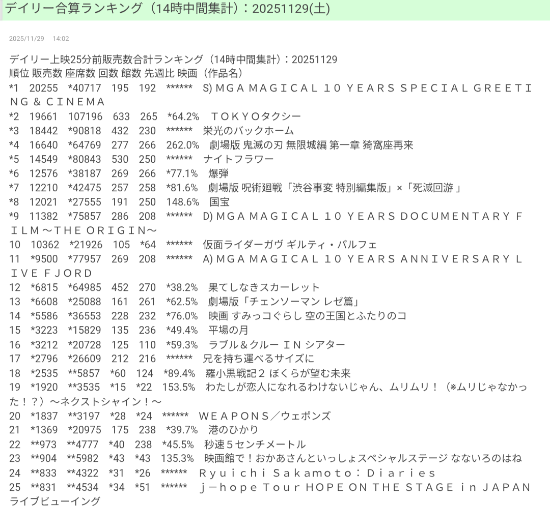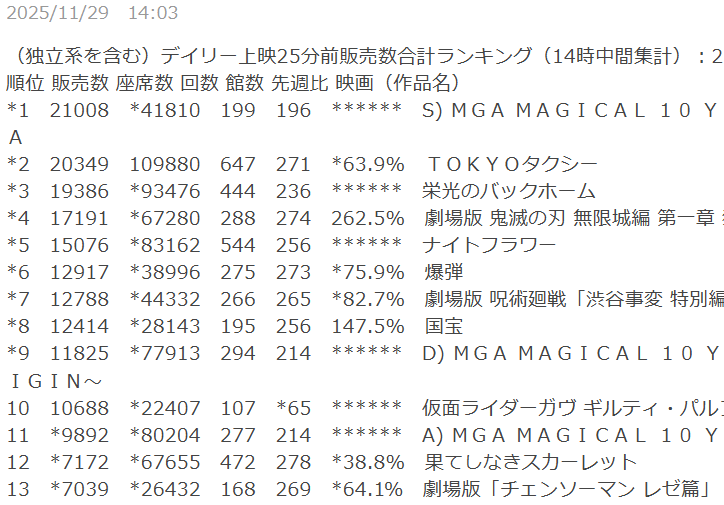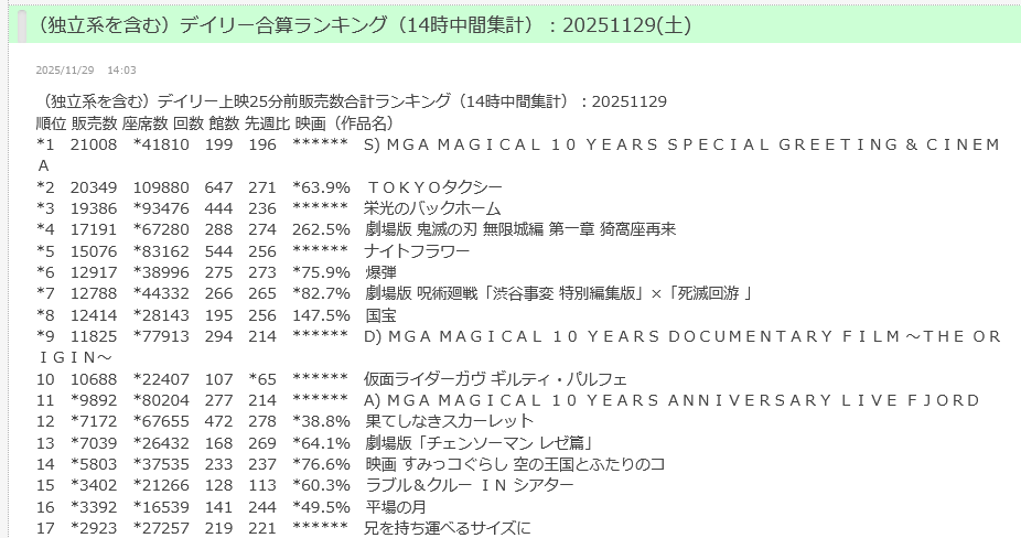 | … | 728無念Nameとしあき25/11/29(土)15:11:53No.1369556659+>近所の話だがIMAXが昼鬼滅で夜スカだから夜には伸びるんじゃないですかね |