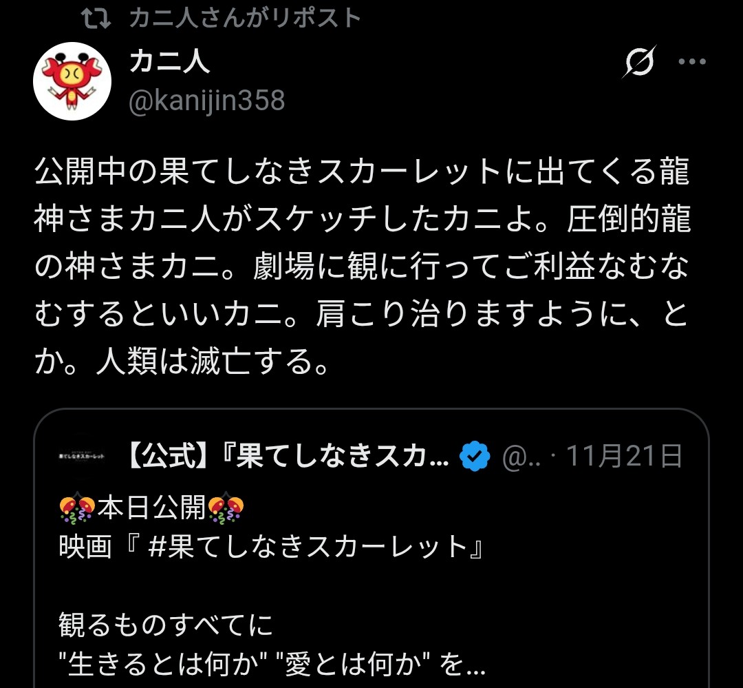 | … | 787無念Nameとしあき25/11/29(土)15:18:04No.1369557935+ 1764397084839.jpg-(202106 B) 果てしなきスカーレット |