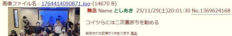 | … | 79無念Nameとしあき25/11/29(土)21:48:58No.1369656371そうだねx7キチガイが集結したオフ会の写真しかも自主的にアップしたという |