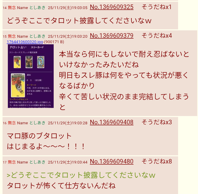 | … | 158無念Nameとしあき25/11/29(土)23:32:17No.1369687246そうだねx4 1764426737377.png-(2287223 B) 恐ろしく執念深いタロット |