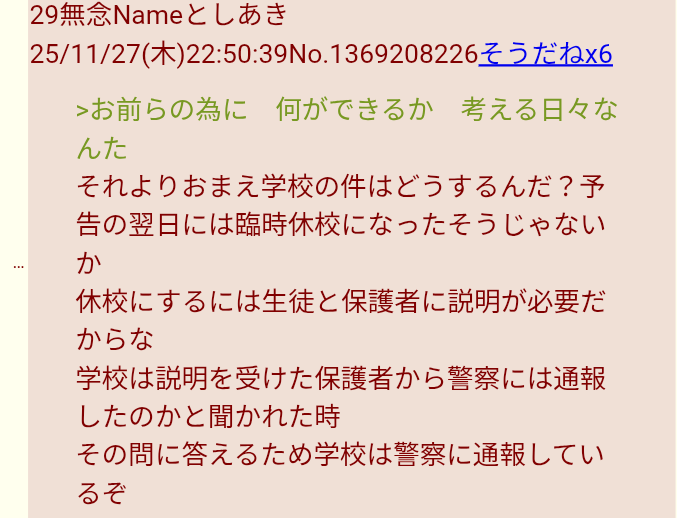 | … | 123無念Nameとしあき25/11/29(土)22:19:56No.1369666073そうだねx1>予告のせいで休校したとかいうのが嘘だとバレてから話題にもならなくなった中学校の痴漢予告 |