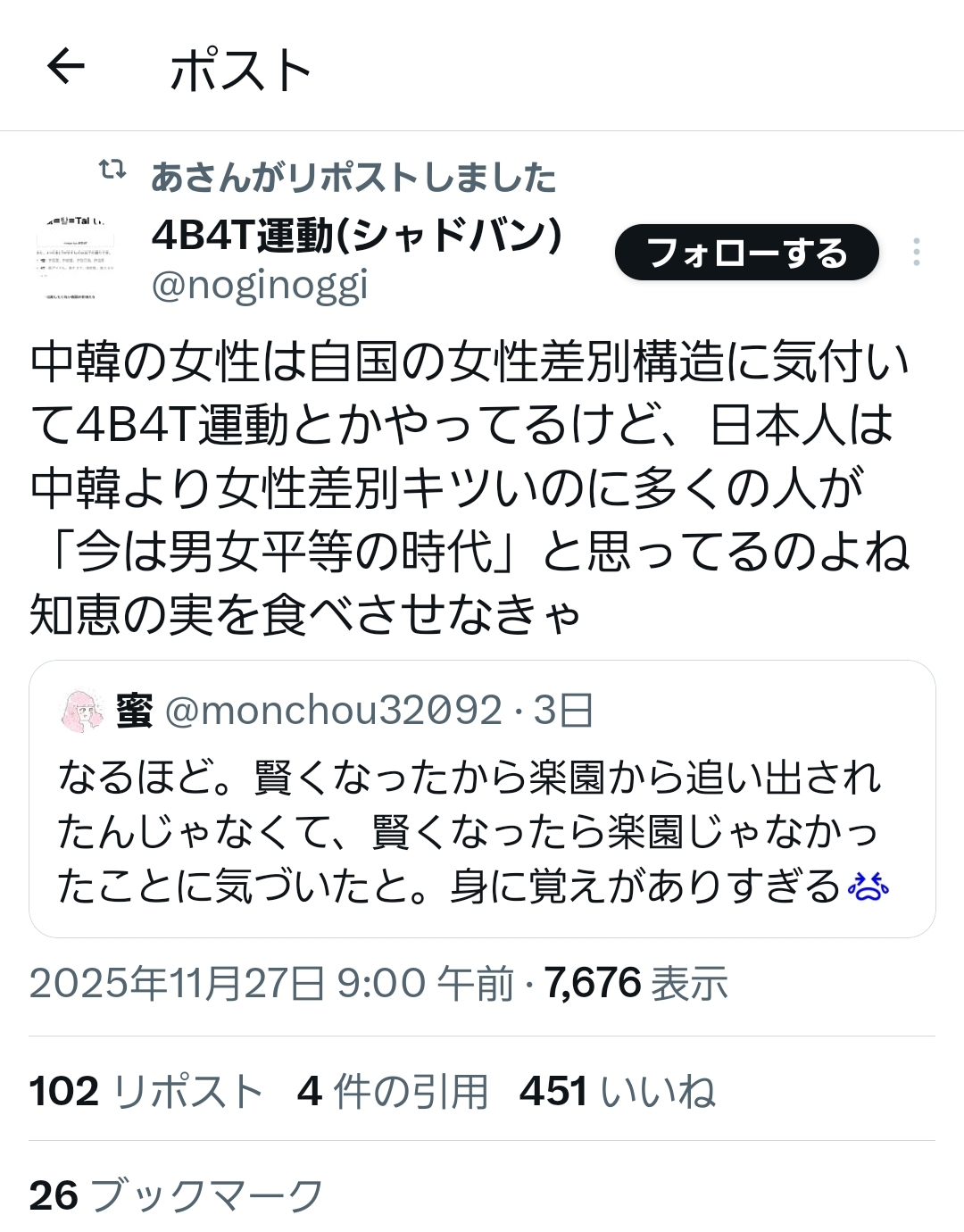 中韓の女性は自国の女性差別構造に気付いて4B4T運動とかやってるけど、日本人は中韓より女性差別キツいのに多くの人が「今は男女平等の時代」と思ってるのよね