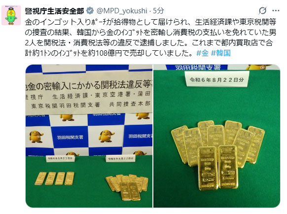 金塊密輸で中国人ら男女9人を逮捕 計約95億円相当の金塊を売却削除された記事が1件あります.見る