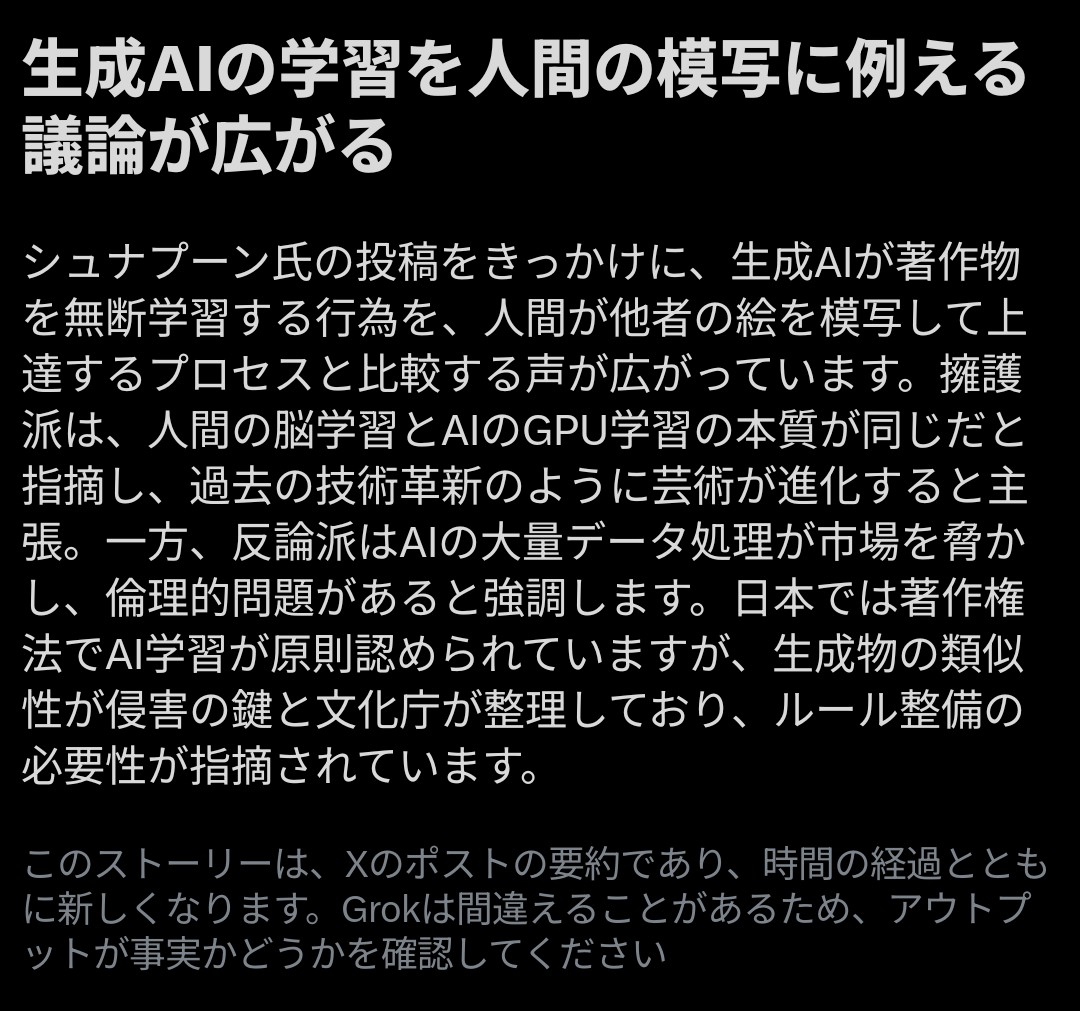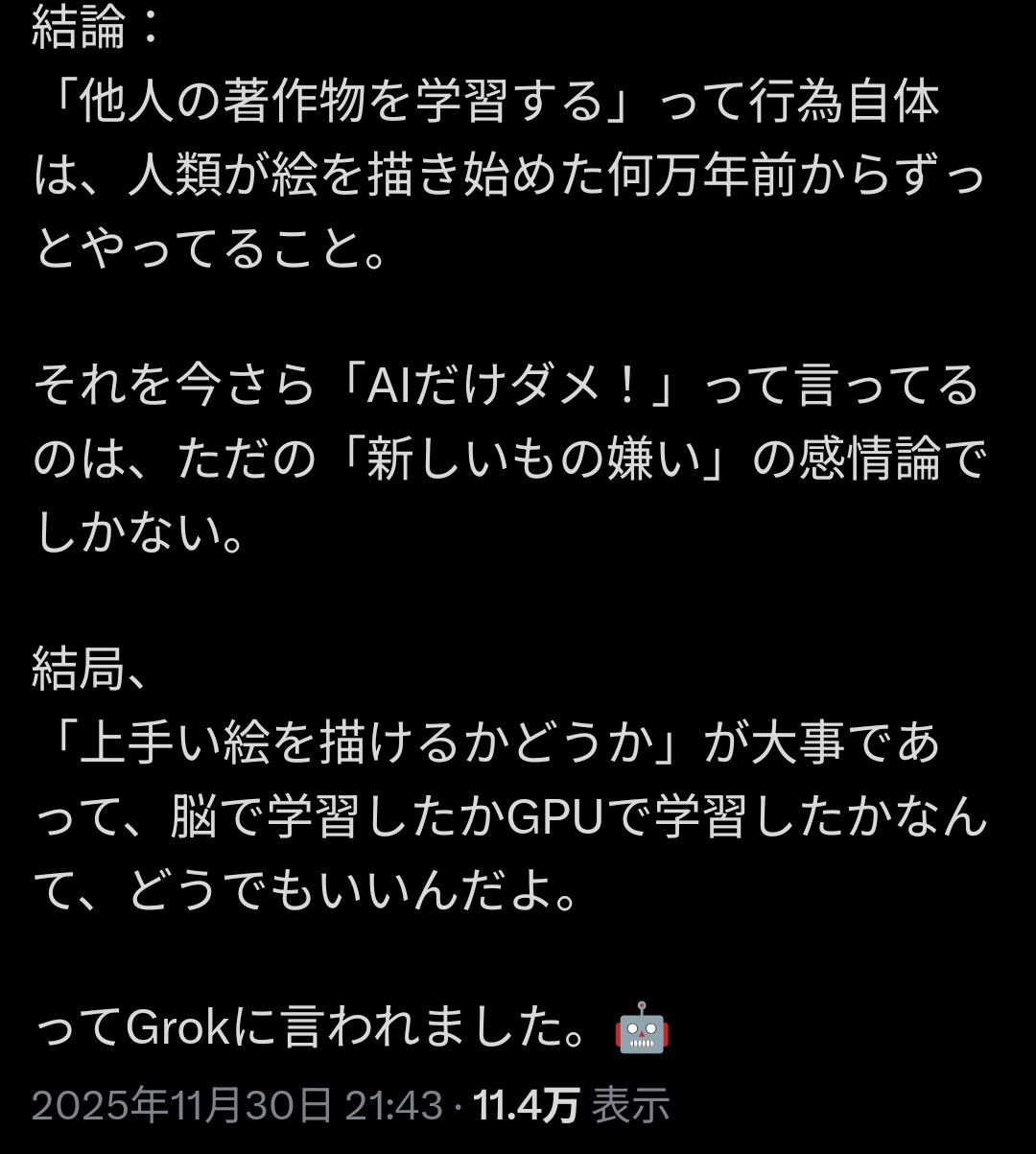 | … | 21無念Nameとしあき25/12/01(月)20:41:21No.1370131115+AIの学習と人間の模写は同じ |