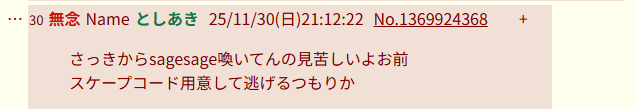 | … | 86無念Nameとしあき25/12/01(月)22:14:27No.1370159503そうだねx1>毎度第三者にマシンガン自白されてるのにここまで無策なの健全sage爺雑魚過ぎませんかね… |