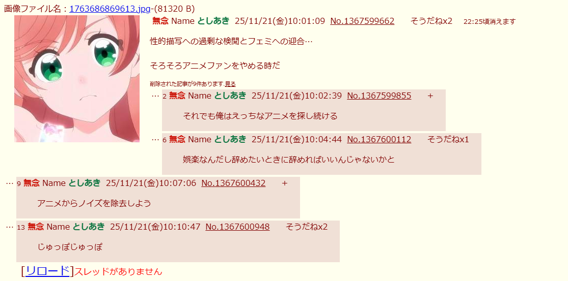 | … | 89無念Nameとしあき25/12/01(月)22:15:06No.1370159690そうだねx3>アニメと現実が区別できないとか相当ヤベェな… |