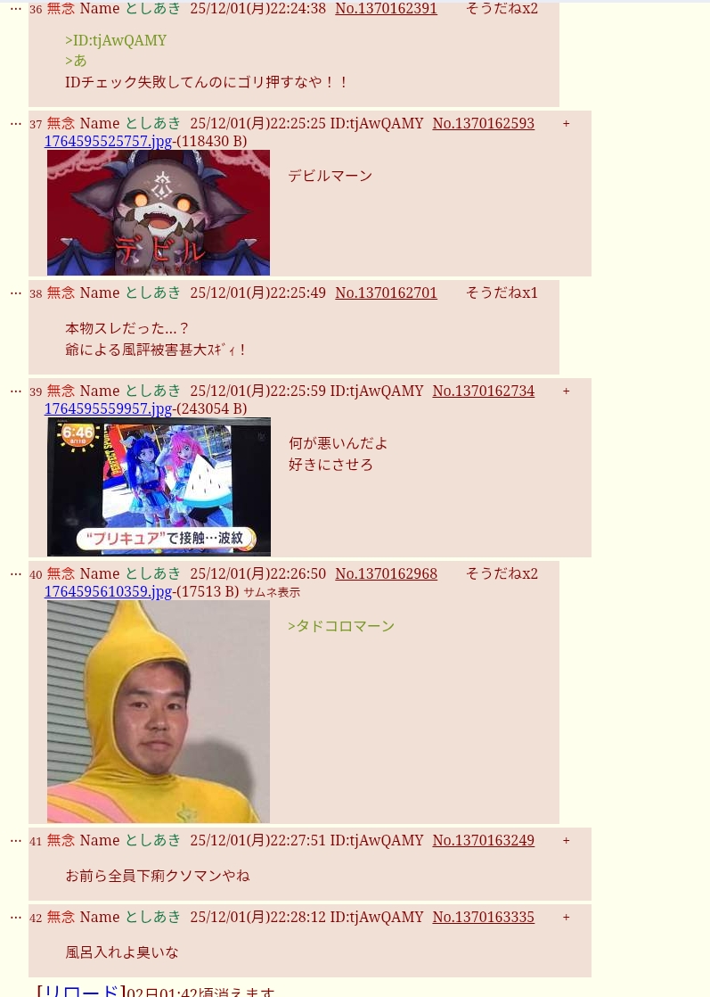 | … | 39無念Nameとしあき25/12/01(月)22:01:30No.1370155721+>今日はプリキュアファンごっこかスレ豚の健全sage爺 |