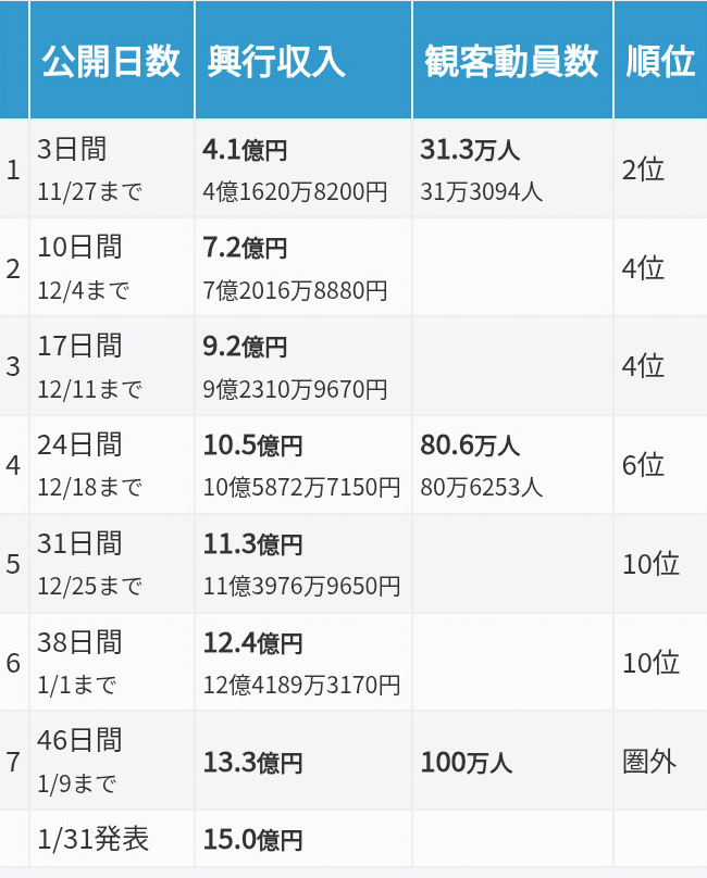 | … | 49無念Nameとしあき25/12/02(火)15:12:59No.1370274707+初週末の売り上げが最終興収の約7割になるそうですよ |