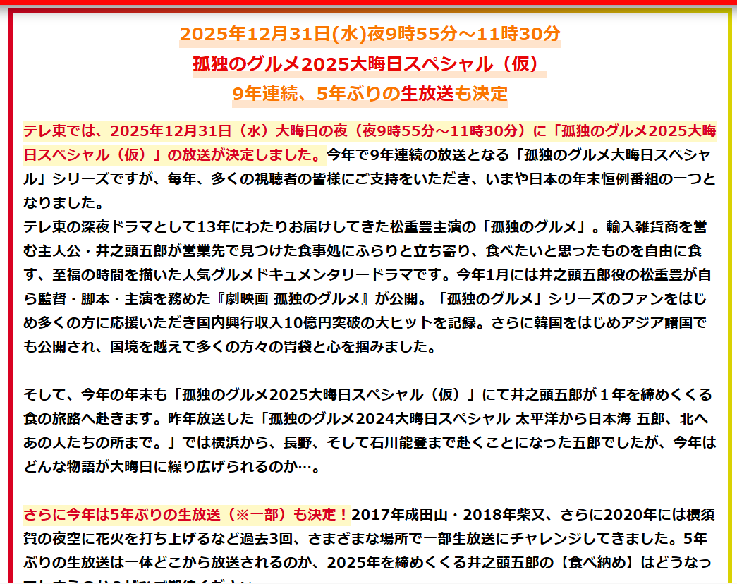 | … | 38無念Nameとしあき25/12/02(火)15:02:02No.1370273042+>孤独のグルメアンチ「監督が10億いかなきゃ次回作作らないって言えばいいんじゃないかな」 |