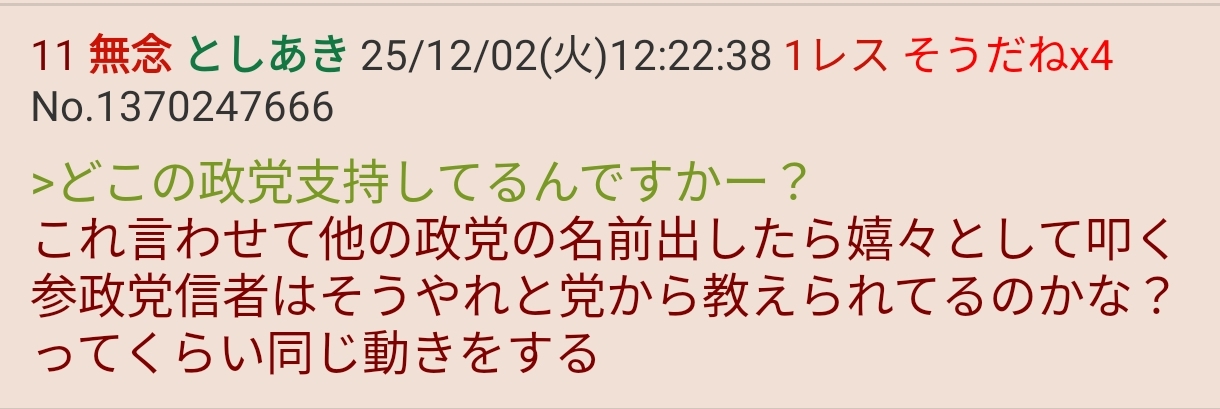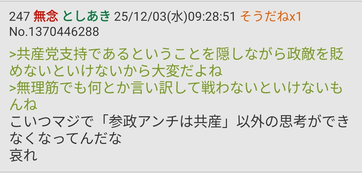 | … | 30無念Nameとしあき25/12/03(水)08:36:44No.1370440796そうだねx6>参政党叩いてる連中って共産党とか好きそう |