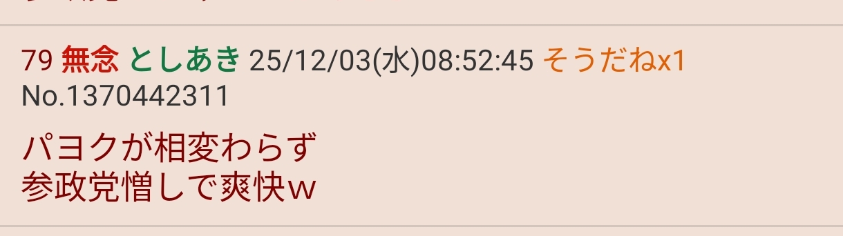 | … | 85無念Nameとしあき25/12/03(水)08:53:46No.1370442414そうだねx2>>参政党に票入れるのはないわ |