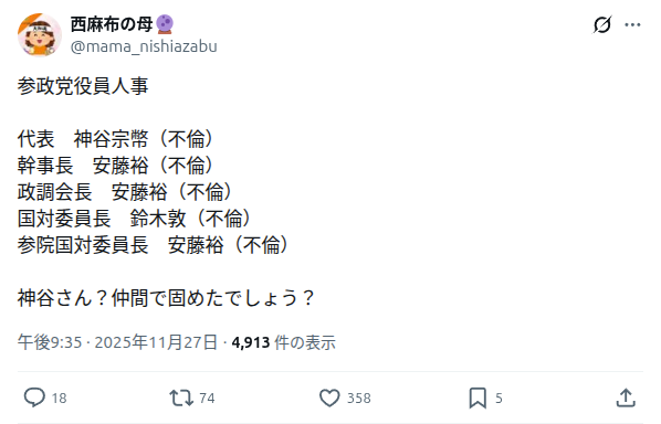 | … | 40無念Nameとしあき25/12/03(水)08:40:41No.1370441167+参政党のボードメンバーが先日粛正されたけど和田が穴埋めするのかな |