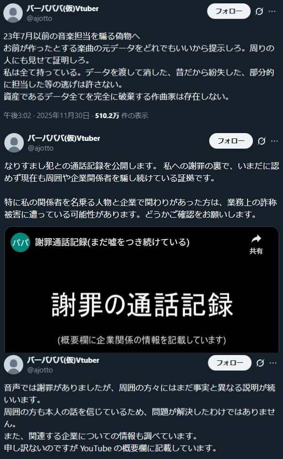 | … | 2無念Nameとしあき25/12/03(水)17:53:37No.1370527538+約5000万再生を記録している代表曲『ウ”ィ”エ”』などで知られる音楽系YouTuber「バーバパパ」(登録者数80万人)が3日にYouTubeを更新。自身になりすまして活動していた人物と通話した音声を公開しました。 |