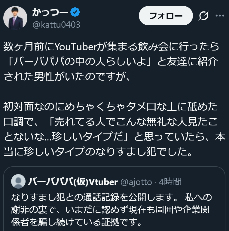 | … | 70無念Nameとしあき25/12/03(水)18:21:36No.1370533543そうだねx6>仲介者であるやしろあずきは、KGを友人だとし、「悪いやつじゃないんで」とフォロー。 |