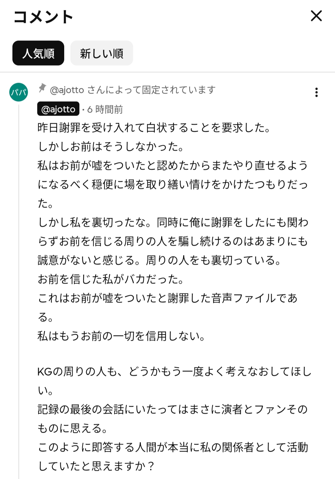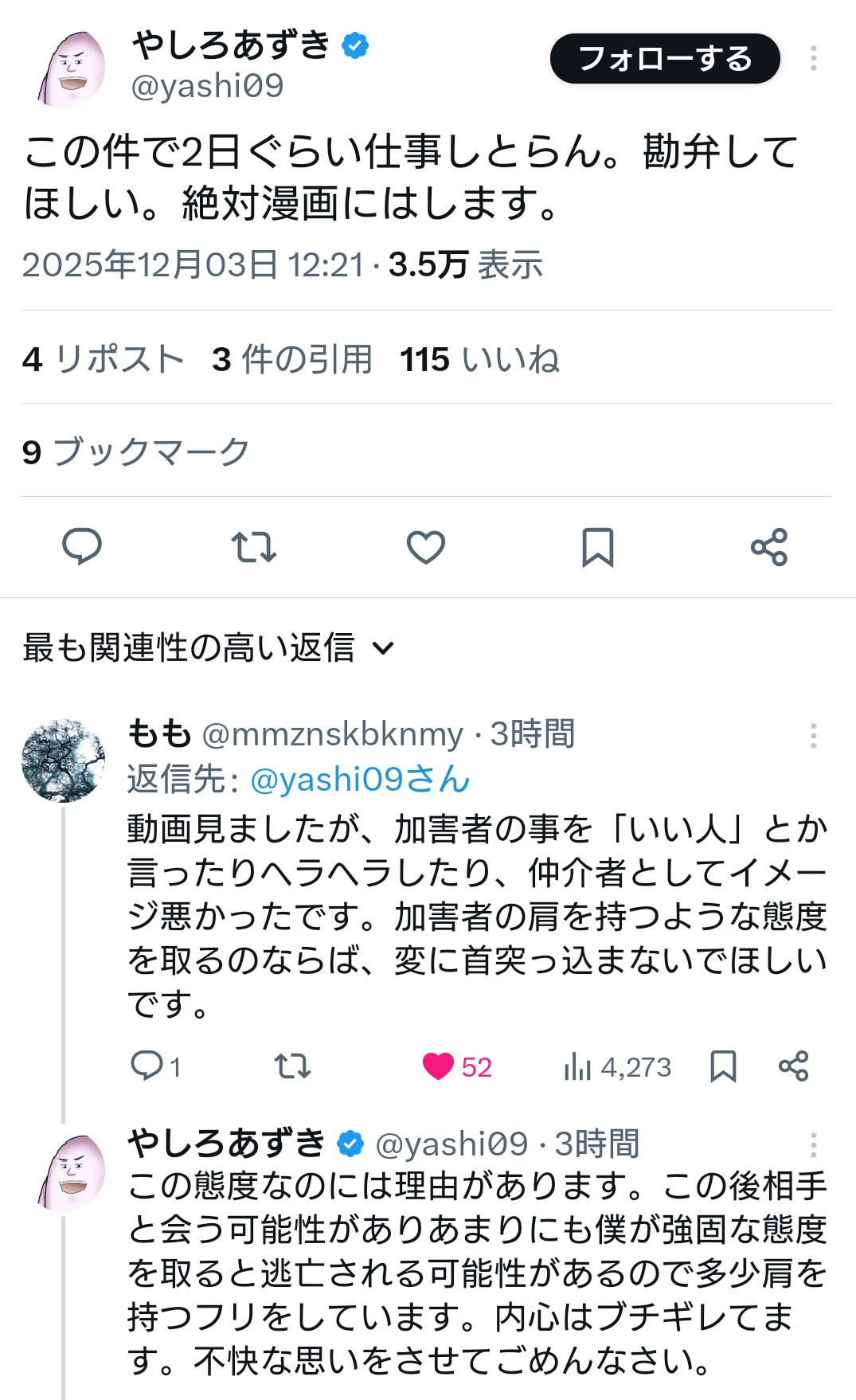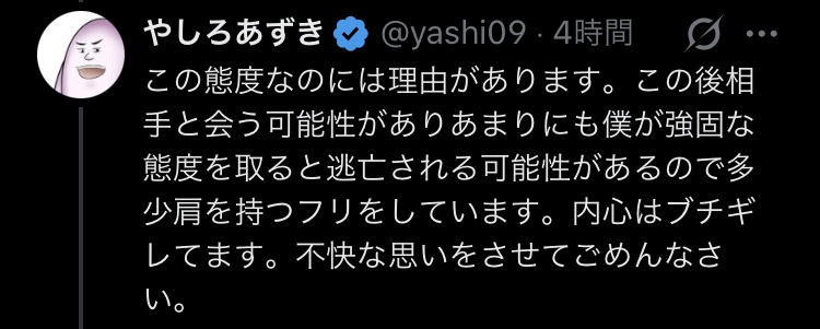 | … | 3無念Nameとしあき25/12/03(水)17:54:41No.1370527761+仲介者であるやしろあずきは、KGを友人だとし、「悪いやつじゃないんで」とフォロー。KGに対しては反省を促しつつ、バーバパパには「僕がちゃんと見ておきますんで安心してみてもらえれば」と約束しました。 |