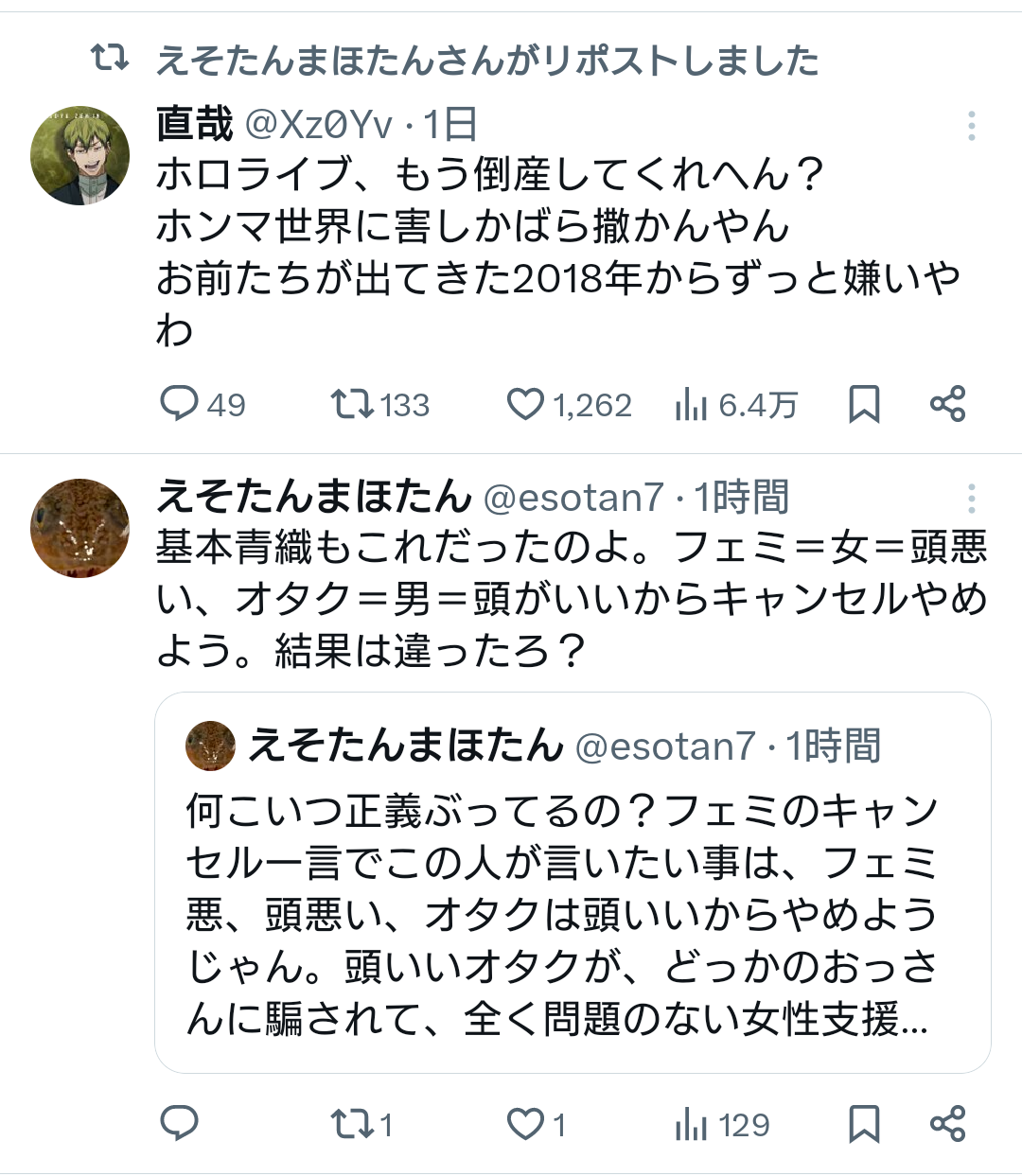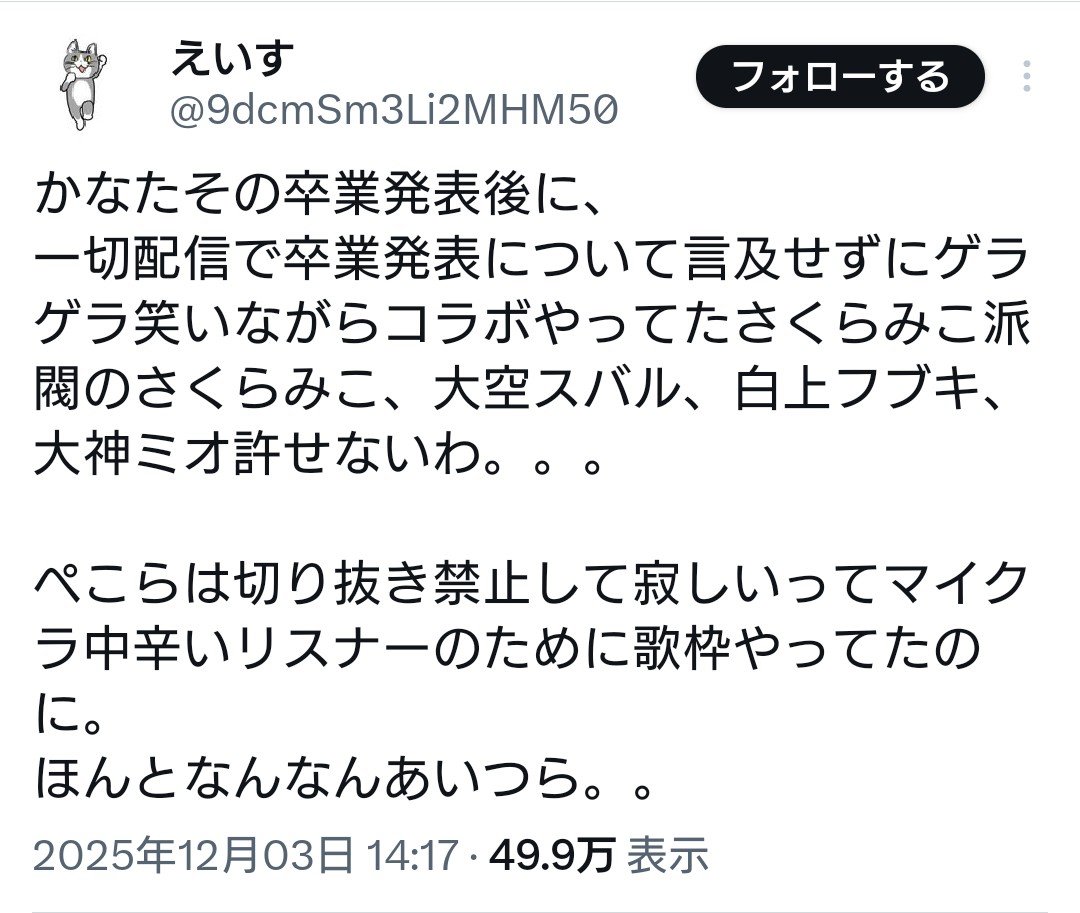 | … | 469無念Nameとしあき25/12/04(木)12:13:37No.1370685576そうだねx2>そもそも過去発言を誰かが引っ張り出したとかじゃなくてリアルタイムの発言で燃えたなら火元を判別するのって不可能じゃないの |
