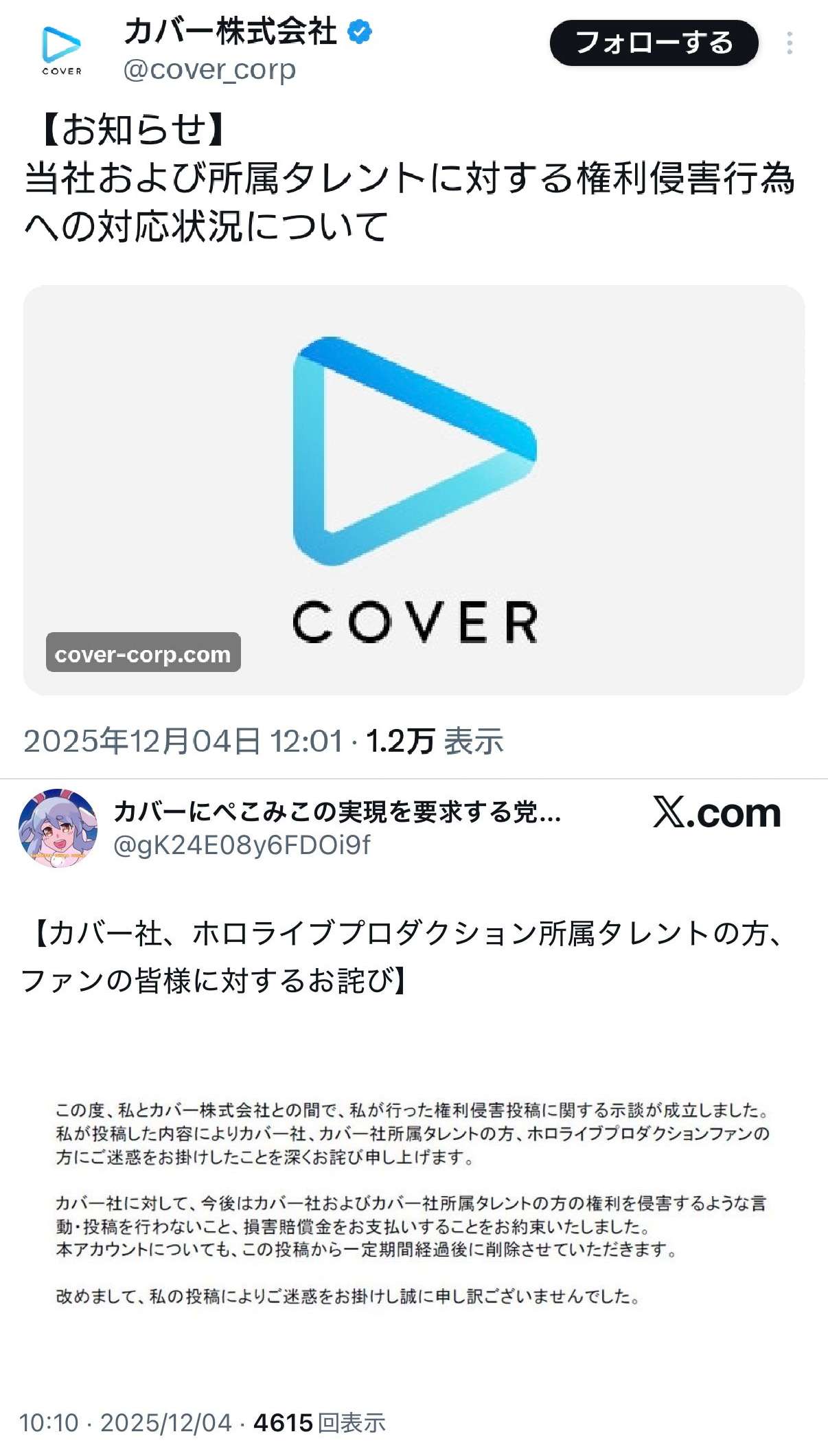 | … | 437無念Nameとしあき25/12/04(木)12:10:02No.1370684995そうだねx1そもそも過去発言を誰かが引っ張り出したとかじゃなくてリアルタイムの発言で燃えたなら火元を判別するのって不可能じゃないの |