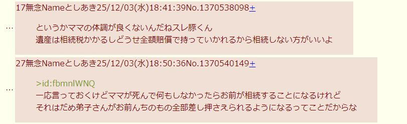 | … | 44無念Nameとしあき25/12/04(木)21:16:25No.1370794369+>>散々極貧扱いしてる癖に相続税がいくら以上でかかるのか知らない法律エアプ |