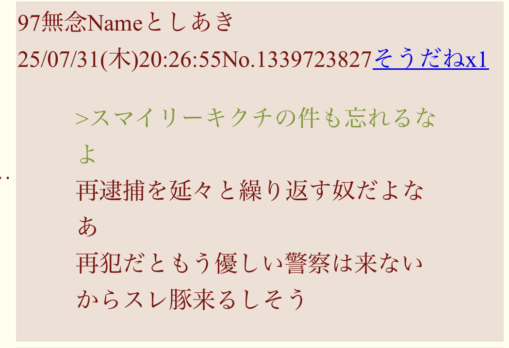 | … | 16無念Nameとしあき25/12/04(木)20:53:19No.1370788018そうだねx3>社長がまた殺害予告スレ立ててるけど |