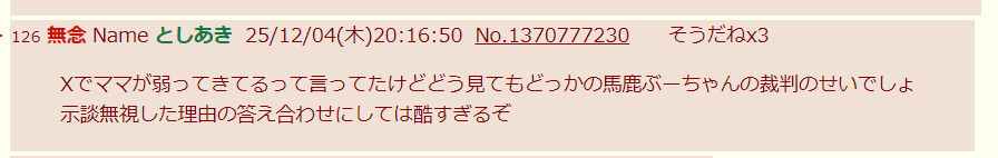 | … | 319無念Nameとしあき25/12/04(木)23:53:38No.1370831907そうだねx7相手が統失というところは絶対はずせない感じなの草 |