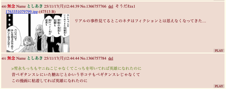 | … | 322無念Nameとしあき25/12/04(木)23:57:41No.1370832732そうだねx3>真面目に70レスくらい読んだけど |