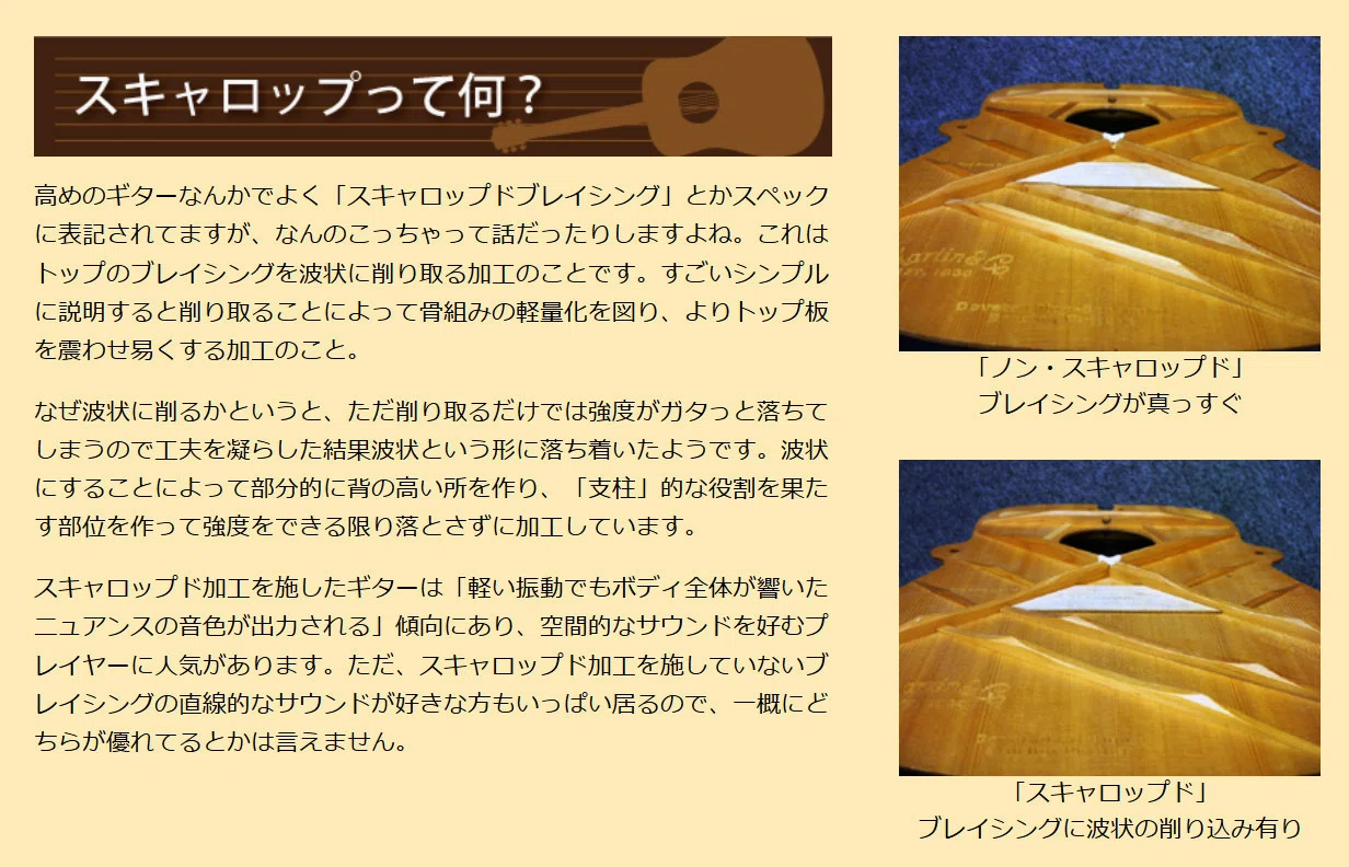 | … | 73無念Nameとしあき25/12/04(木)23:29:18No.1370827245+ 1764858558686.webp-(176988 B) アコギのトップ材の裏側に貼られている補強材のブレーシングの形状によっても強度が変わる |