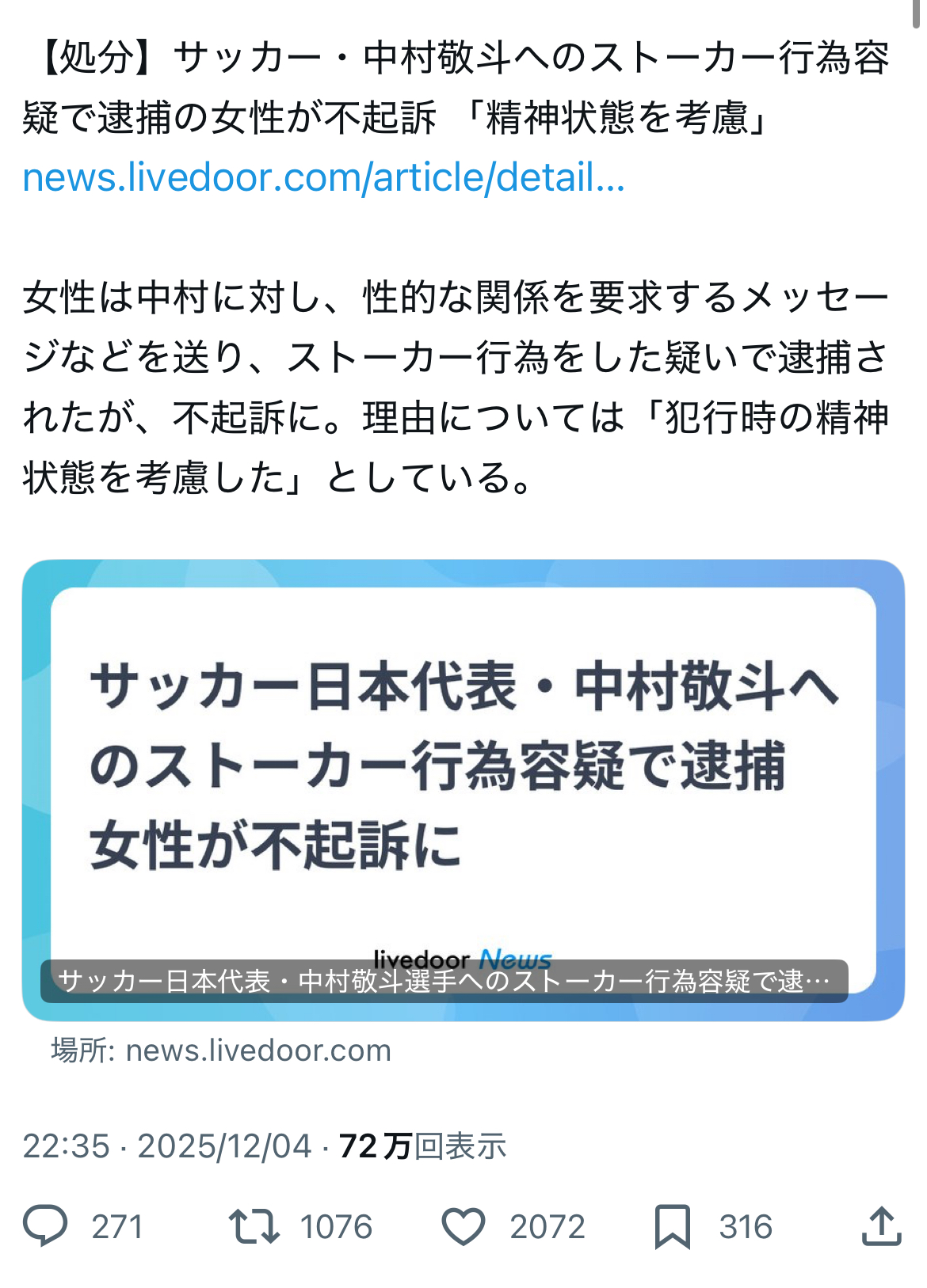 | … | 39無念Nameとしあき25/12/05(金)08:09:20No.1370865521そうだねx4どんな事情があっても後出しジャンケンで相手を一方的に犯罪者扱い出来るんだから怖すぎる |