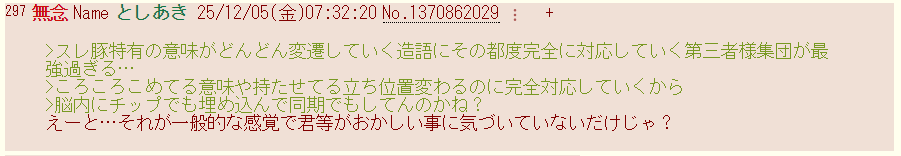 | … | 27無念Nameとしあき25/12/05(金)07:38:38No.1370862507そうだねx4>これは「それはあいつら」って連呼する事でいやなワードの受け取りを拒否するっていう |