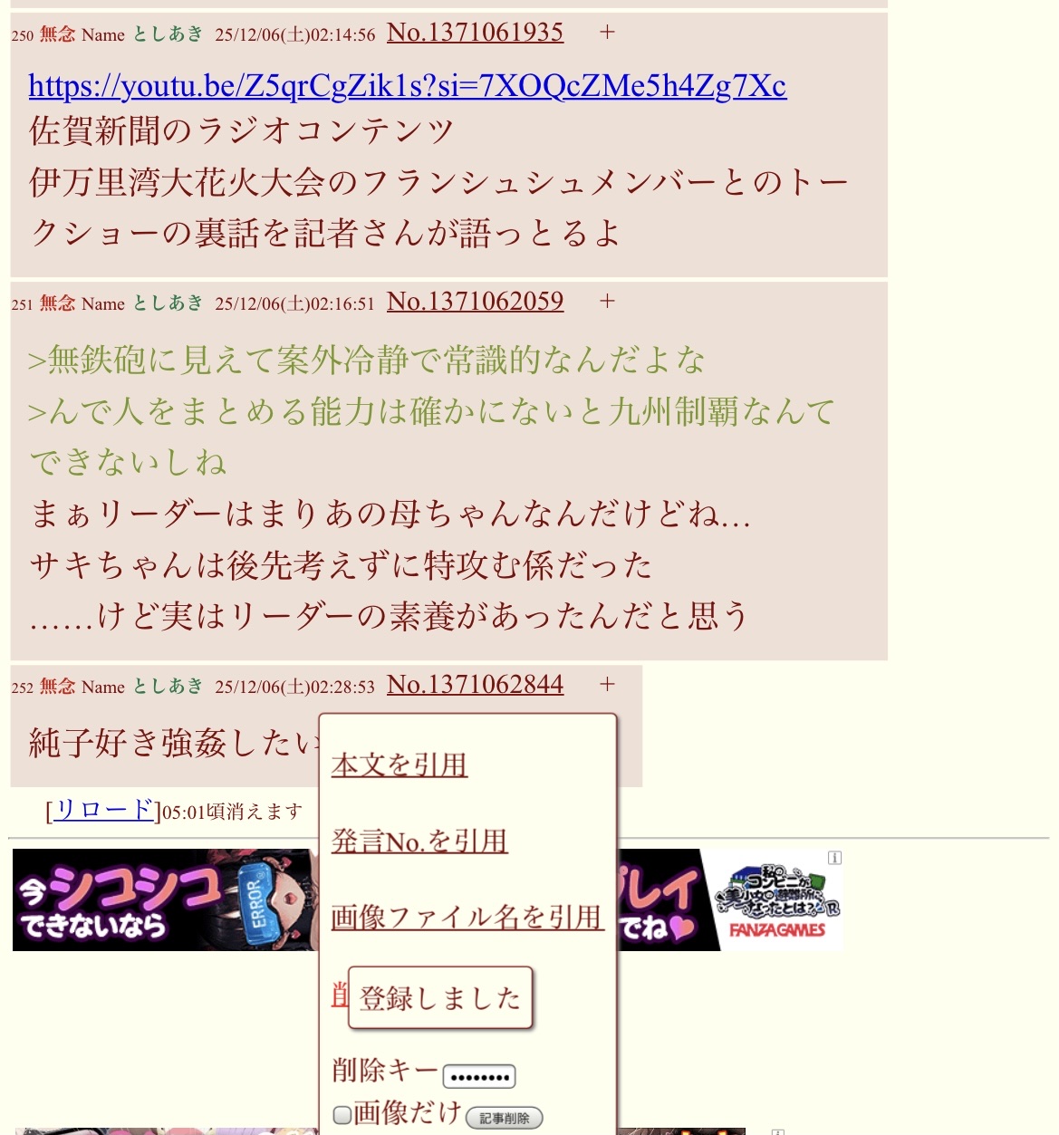 | … | 252無念Nameとしあき25/12/06(土)02:28:53No.1371062844+純子好き強姦したい |