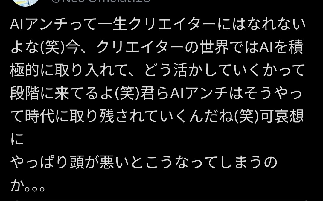 | … | 90無念Nameとしあき25/12/06(土)06:04:35No.1371071787+>>神絵師になってチヤホヤされる夢が生成AIに潰されて復讐に燃えてそう |