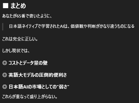 | … | 65無念Nameとしあき25/12/06(土)03:07:02No.1371064822+LLMなんて言語で学習してるんだから日本語ネイティブで学習されたAI作ったら結構違ったものになるだろうにな |