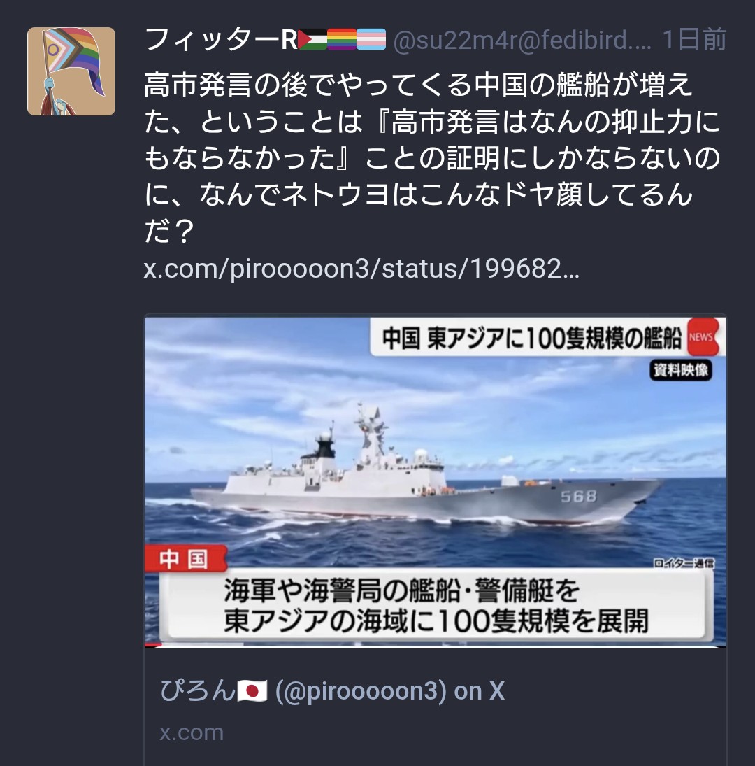 | … | 83無念Nameとしあき25/12/07(日)23:20:33No.1371555524そうだねx3>一つの中国は台湾の事 |