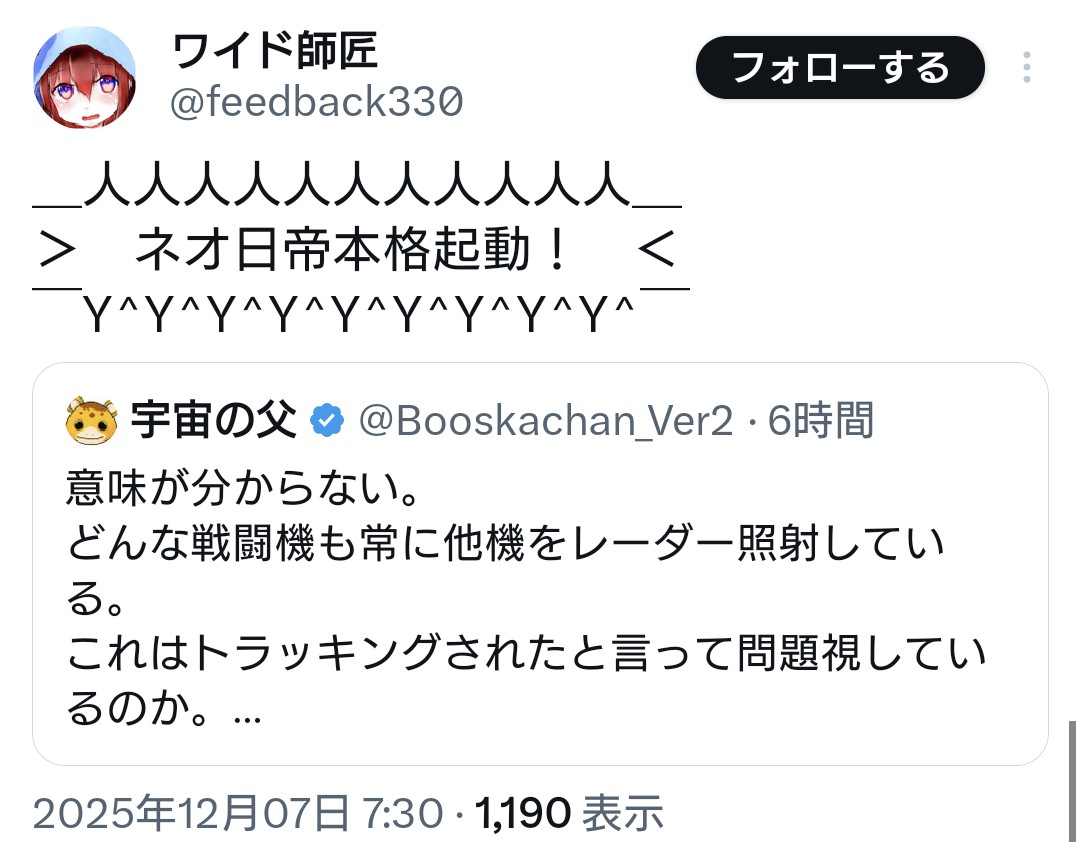 | … | 94無念Nameとしあき25/12/07(日)23:22:16No.1371555927そうだねx19レーダー照射の件で |