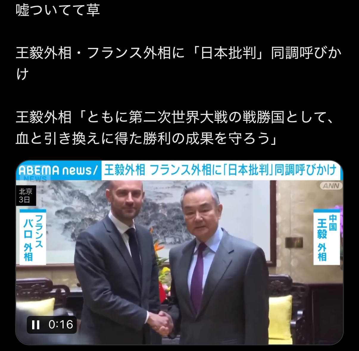 | … | 729無念Nameとしあき25/12/08(月)01:19:26No.1371577309そうだねx2>戦狼外交(笑) |