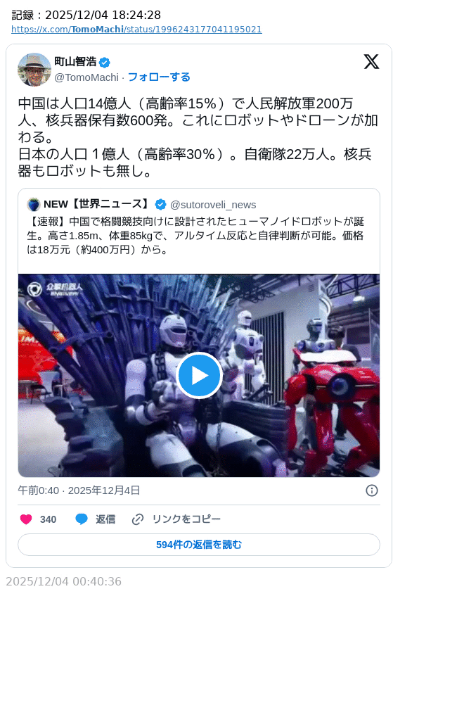 | … | 78無念Nameとしあき25/12/07(日)23:19:48No.1371555338そうだねx6中国は危険な国って中国自身が証明しまくってるから |
