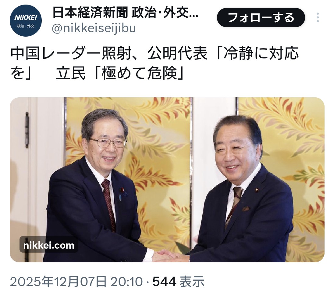 | … | 40無念Nameとしあき25/12/07(日)23:12:12No.1371553636そうだねx16>立憲民主党の野田佳彦代表は7日、中国軍機による航空自衛隊戦闘機へのレーダー照射について「極めて危険な行為で、挑発が過ぎる。日本政府として厳しく抗議すべきだ」と中国側を批判した |