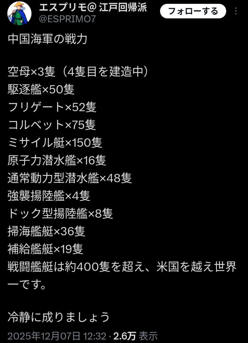 | … | 77無念Nameとしあき25/12/07(日)23:19:38No.1371555300+>100隻を超える大艦隊が台湾周辺うろちょろしてるみたいだけど何してんの? |