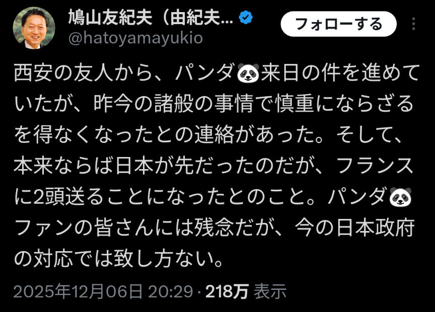 | … | 675無念Nameとしあき25/12/08(月)00:50:56No.1371573284そうだねx9 1765122656378.jpg-(87448 B) >高市のせいでますますパンダが見られなくなる |
