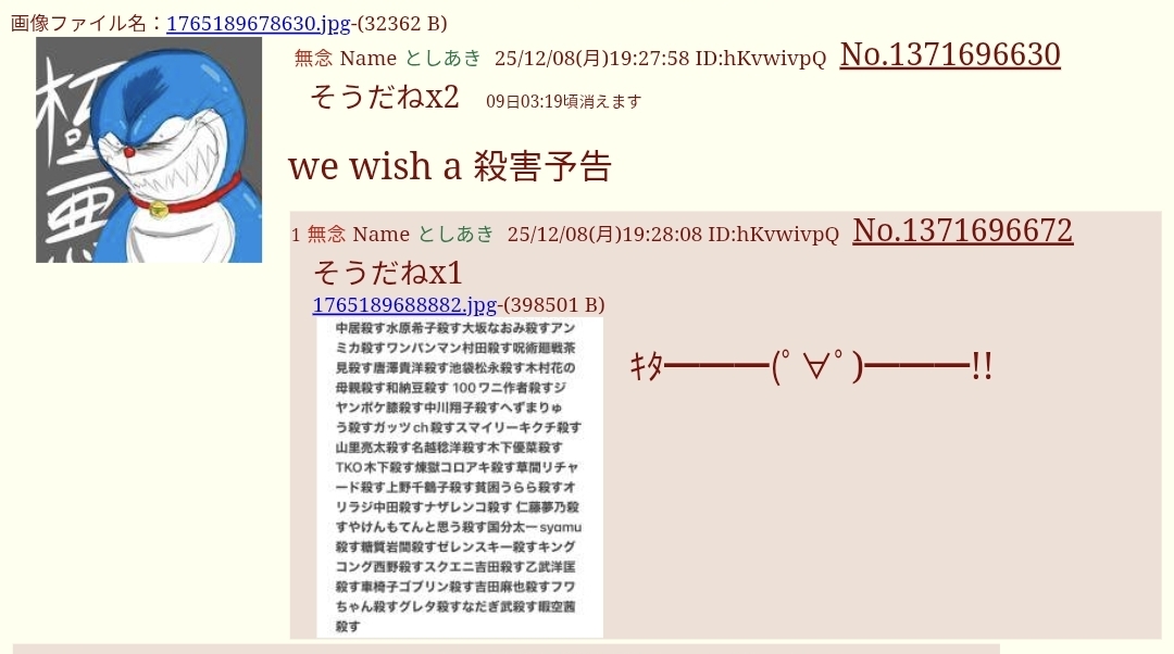 | … | 6無念Nameとしあき25/12/08(月)19:32:13No.1371697708そうだねx16>we wish a 殺害予告 |