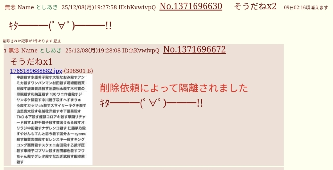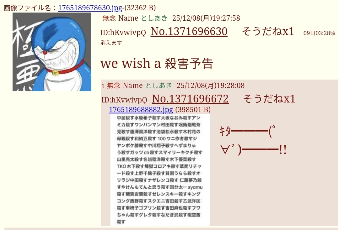 | … | 72無念Nameとしあき25/12/08(月)20:18:53No.1371710910+>we wish a 殺害予告 |