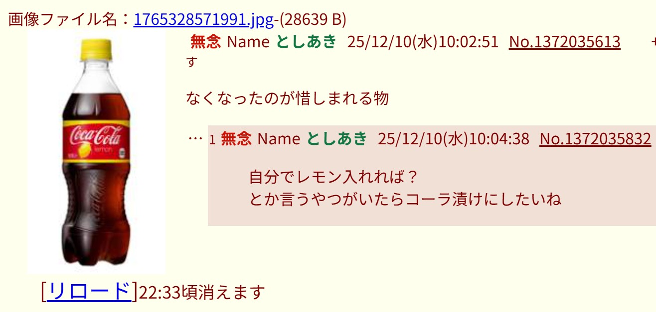 | … | 32無念Nameとしあき25/12/10(水)10:10:55No.1372036642+ 1765329055426.jpg-(115707 B) そういやスレあきはペットボトルの話してたからこれからdelの対象になるな |