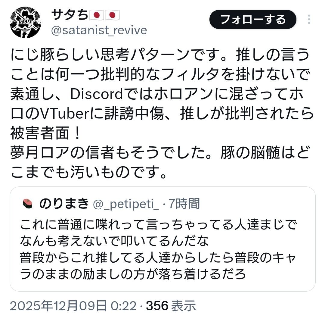| … | 359無念Nameとしあき25/12/10(水)12:28:02No.1372056157そうだねx1>アニメとかvtuber見てたらキチガイになる証明だ |