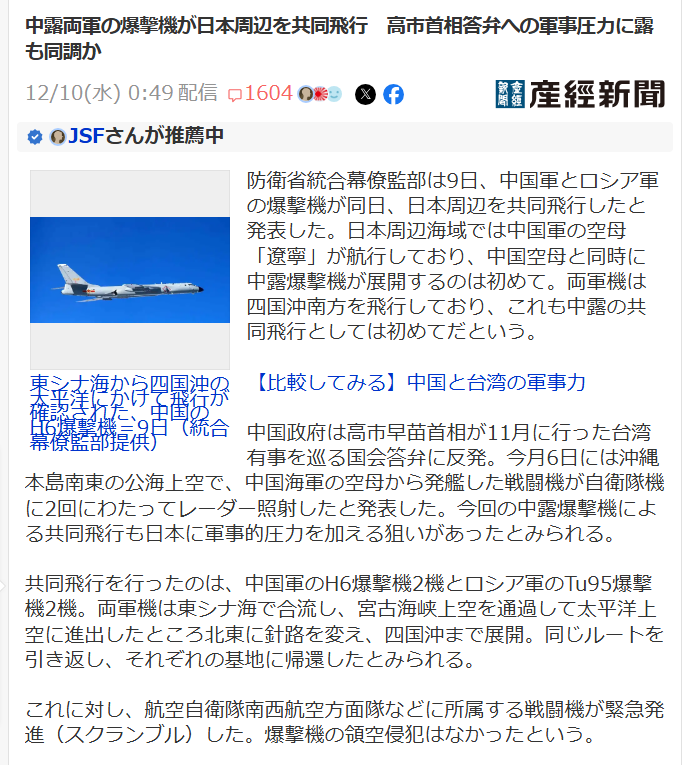 | … | 2無念Nameとしあき25/12/10(水)12:02:18No.1372051165+これで中国側は「訓練は事前通告して日本は了承したのに自衛隊機は嫌がらせで中国機に接近したから(牽制のために)レーダー照射した」とか言ってるのか… |