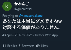 | … | 346無念Nameとしあき25/12/12(金)00:54:50No.1372424313+>>結局こんな感じで暇空信者って糖質ではあるけど |